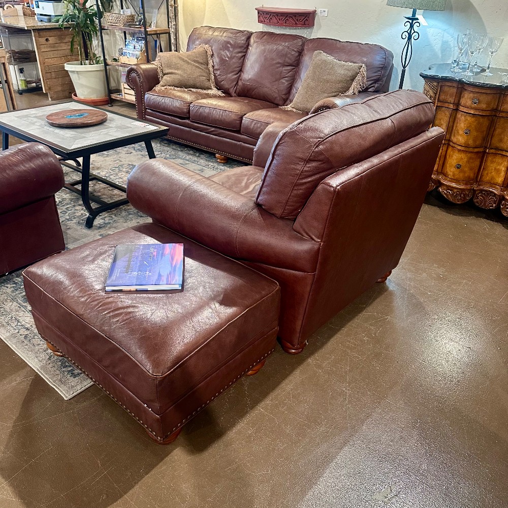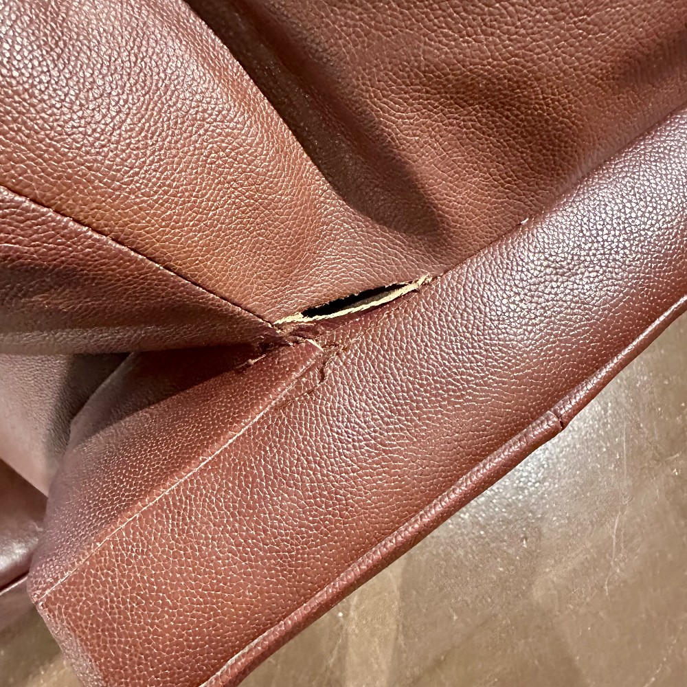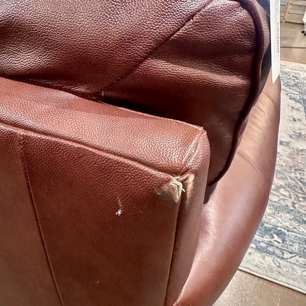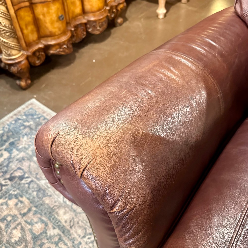 CONDITION: GOOD/FAIR. Some tears at back edge near cushion. Normal wear and tear at armrests.