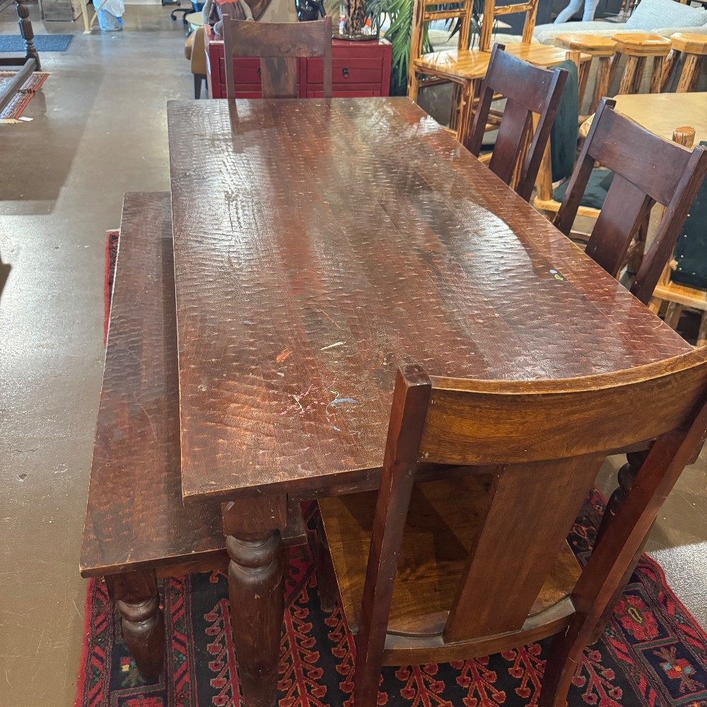 Table: 82"(L) x 38.25"(W), includes 4 chairs and 1 bench