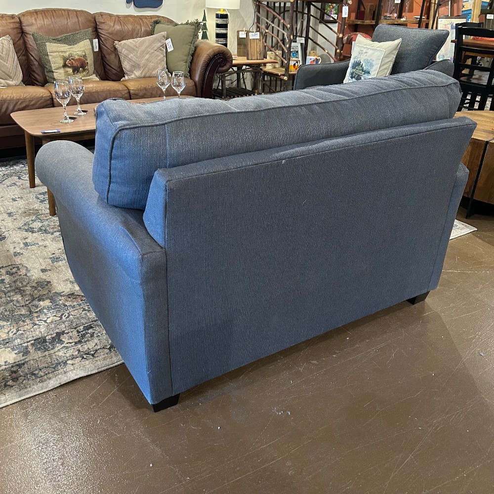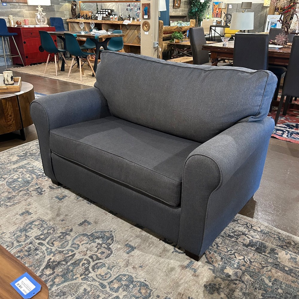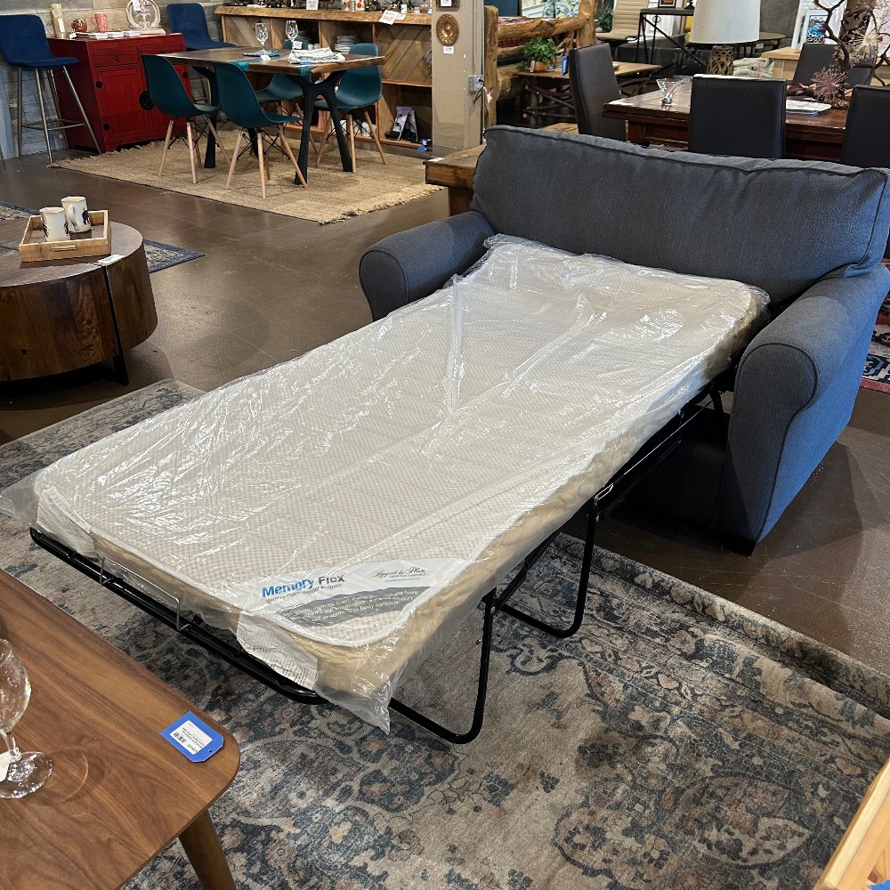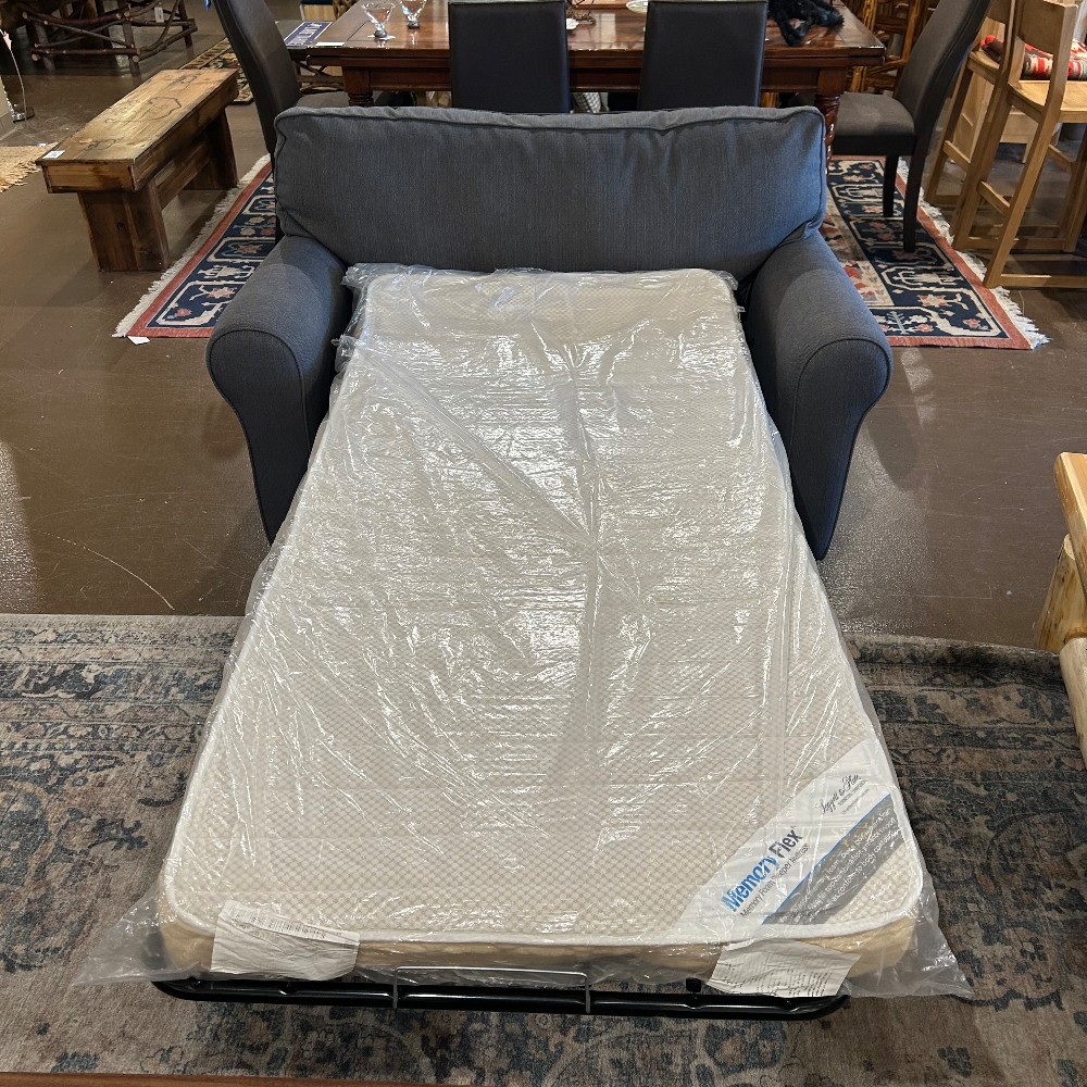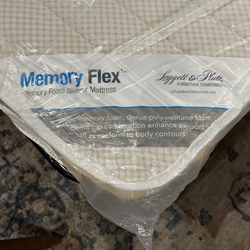 The mattress still has the plastic on it but one side of the seat cushion is starting to peel